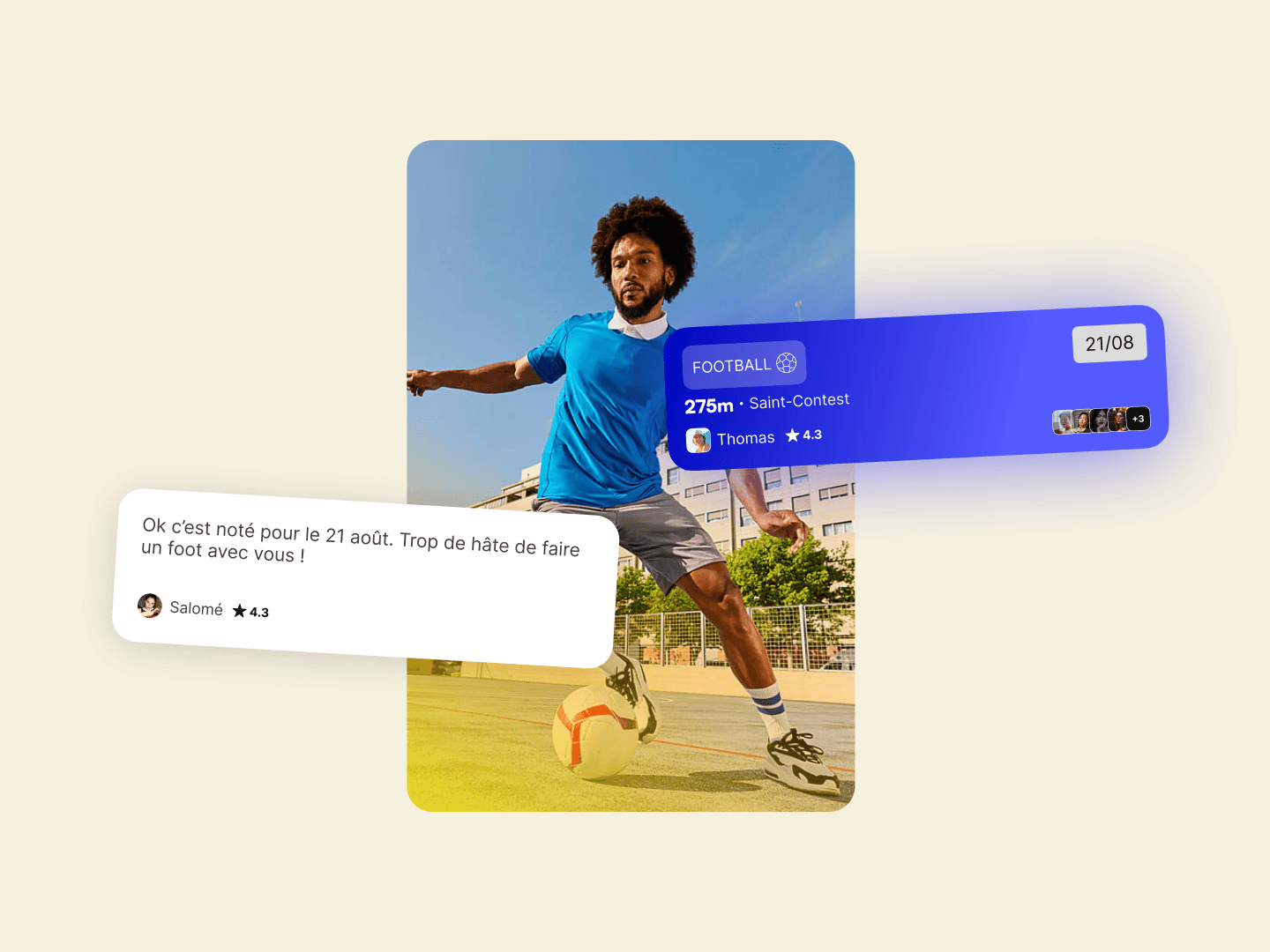 L’interface s’adapte à différents cas d’usage : profil, recherche d’activités, notifications, ou création de parties.