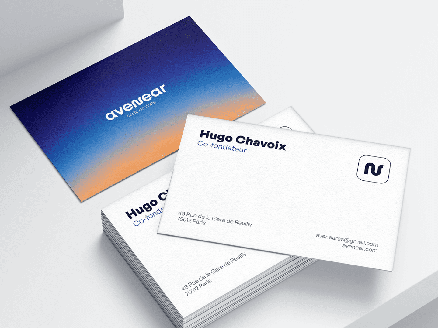 Pour permettre au client de se projeter dans l’univers d’Avenear, j’ai réalisé plusieurs mockups illustrant l’application concrète de l’identité visuelle.
